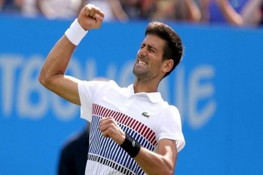novak djokovic proved his form for wimbledon by beating gael monfils 6 3 6 4 to win the aegon international on saturday