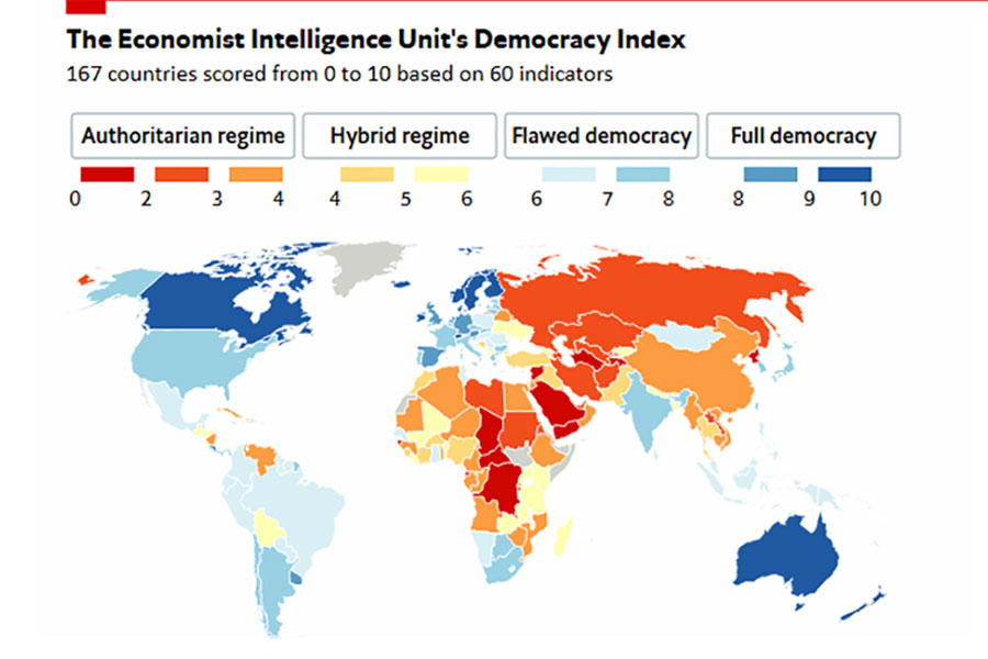 The EIU report released on Wednesday says only countries with scores above 8 are categorised as "full" democracies.