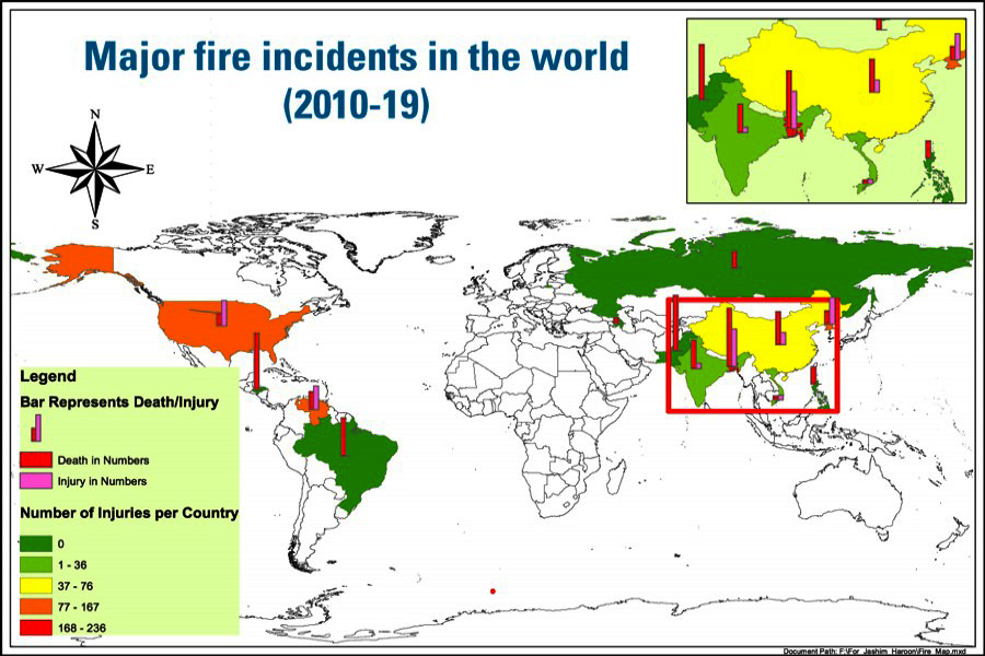 Bangladesh topped the list of deaths in major "structure fire" incidents in the world in the last one decade since 2010, according to Wikipedia.