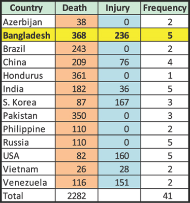 The death toll from five big structure fire incidents rose to 368 in Bangladesh in the last one decade.