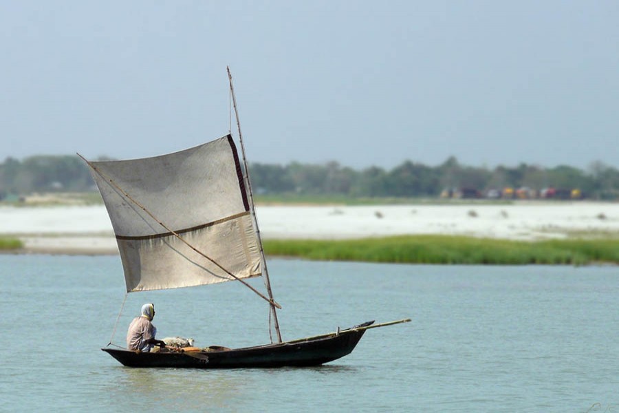 Recent print media photographs of country-boats with colourful sails plying...
