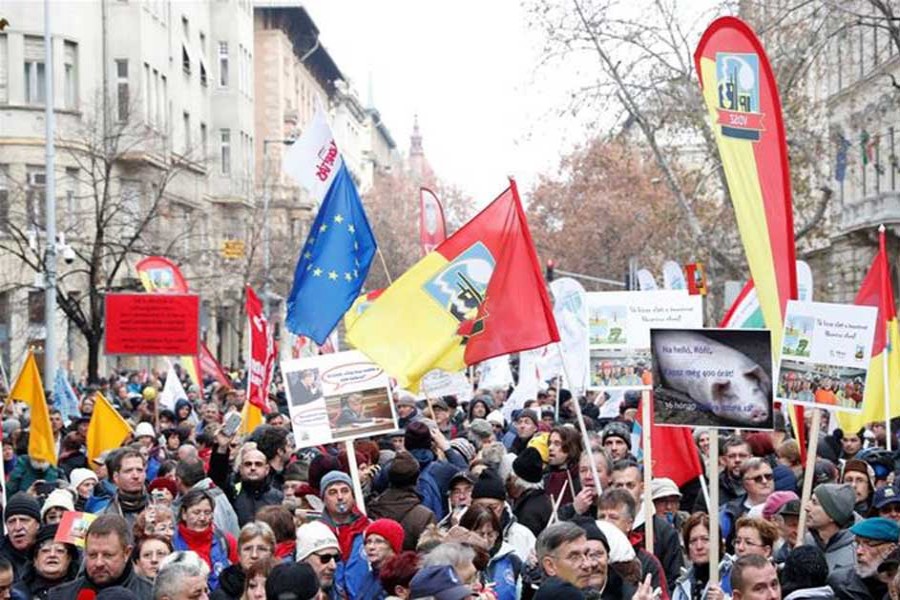 Street protests in Budapest against new legislation governing overtime work...