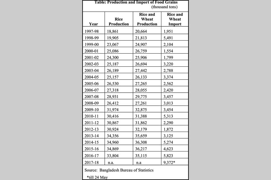 The import figures of the last two decades raise considerable doubt about achieving self-sufficiency in food production. Food import as a percentage of food production was mostly in double digits or there about. The worst so far is the import of 25.2 per cent of the food production in 1998-99. This figure will be almost certainly dwarfed when all the relevant data for 2017-18 becomes available. Bangladesh will likely become the second highest rice importer of the world after China. It is a stroke of luck that the world grain market has not been tight this year such that rice and wheat could be purchased at affordable prices which prevented undue pressures on the balance of payments. The country cannot depend on luck always. The Food and Agriculture Organisation (FAO) has forecasted a reduction in world cereal stock in 2018-19 after several years of increase because of a downturn in production of some crops including wheat which is the main cereal import item of Bangladesh. This could impart an upward pressure on the import costs.