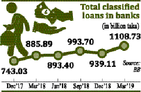In contrast, the total classified loans with 40 private commercial banks (PCBs) soared to Tk 499.50 billion in the Q1 of 2019 from Tk 381.40 billion three months before.