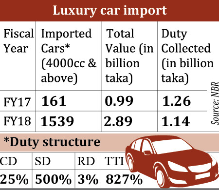 In contrast, the national tax collector received Tk 1.26 billion duty against the imports of 161 similar category cars in 2016-17.