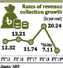 The total tax revenue collection, however, registered a 7.11 per cent growth during the July-March period of FY 2018-19 over the same period of the last fiscal, according to provisional official figures.